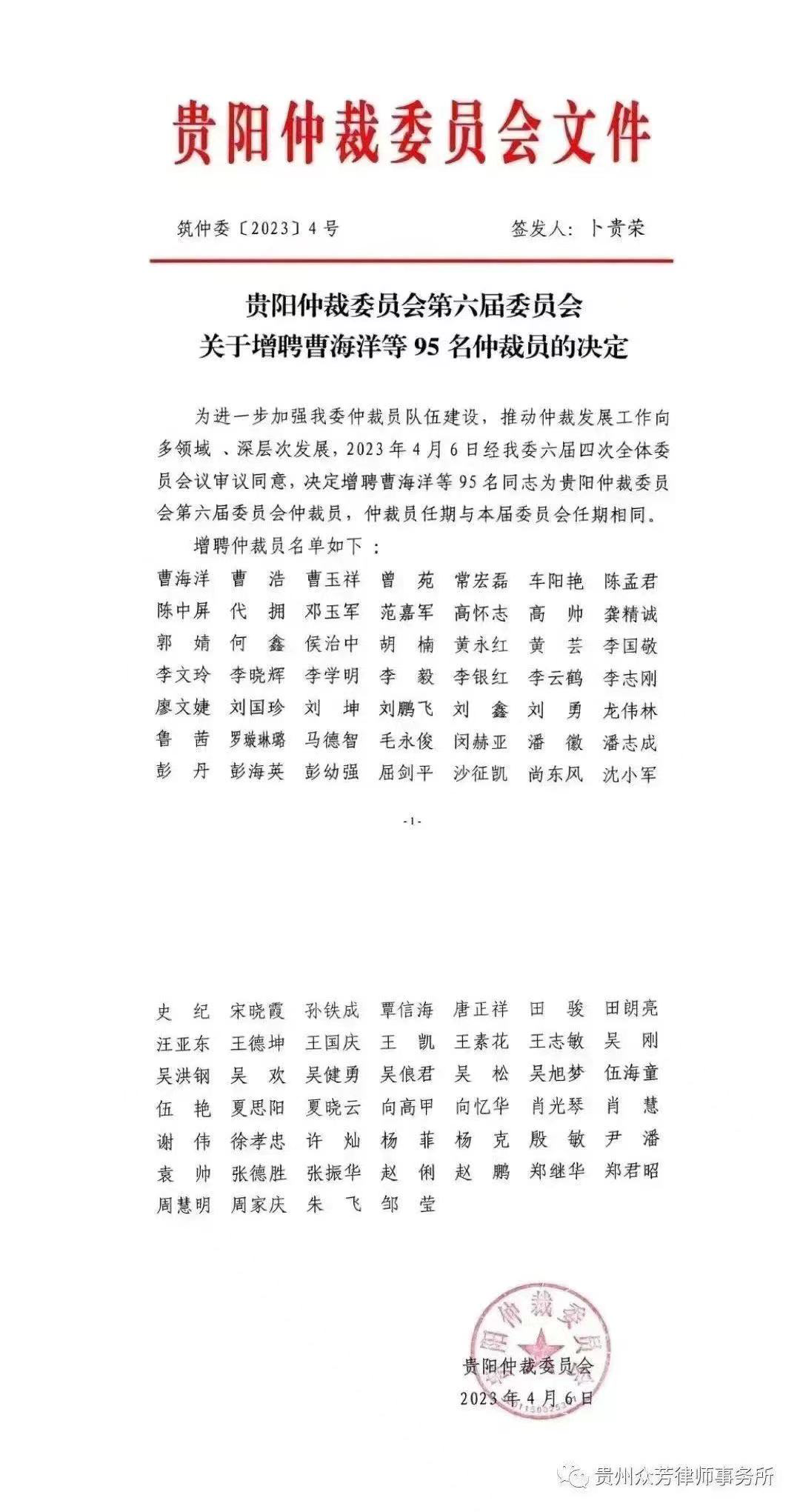 为进一步加强仲裁员队伍建设,推动仲裁发展工作向多领域、深层次发展,近日,经贵阳市仲裁委员会六届四次全体委员会决定增聘95名同志为贵阳仲裁委员会第六届委员会仲裁员。公司人生就是博ag(中国区)·公司官网彭丹、杨菲、龚精诚、李晓辉、车阳艳等老师获聘为贵阳仲裁委员会仲裁员。贵阳仲裁委员会是贵阳市人民政府依照《中华人民共和国仲裁…
