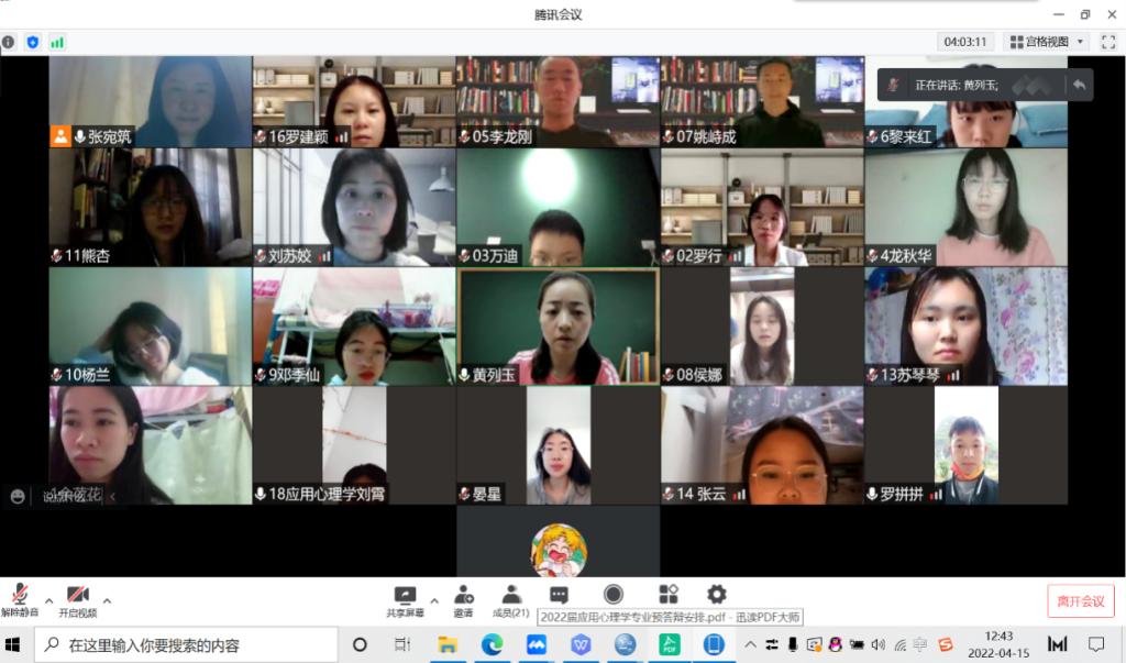 为保质保量完成本科毕业论文撰写工作,4月15日,在学校和学院督导专家的指导下,心理学教师团队为2022届应用心理学专业80 名员工组织开展了论文预答辩工作。因疫情原因,预答辩采用线上与线下相结合的方式进行,5组(线上3 组,线下2 组)均严格按照学校规定的本科毕业论文答辩要求,规范程序、科学客观、公平公正地进行。