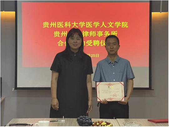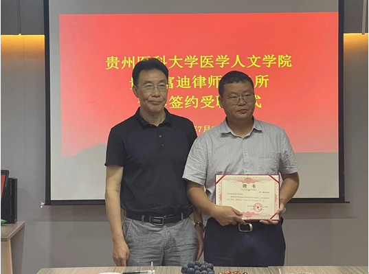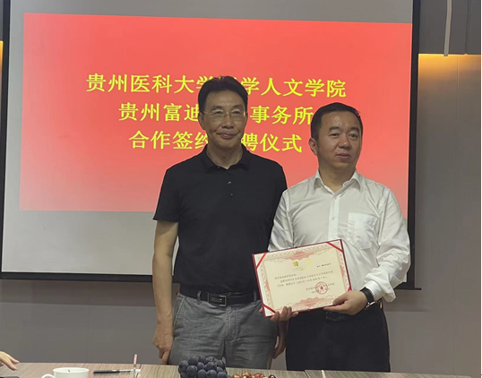 会上,江宣成代表学院向贵州富迪律师事务所授牌。韩贞习、张贤代表学院向归东、张柱都、颜仕武颁发校外实习导师聘书。彭丹代表学院签订全面合作协议及共建实践教学基地协议。
