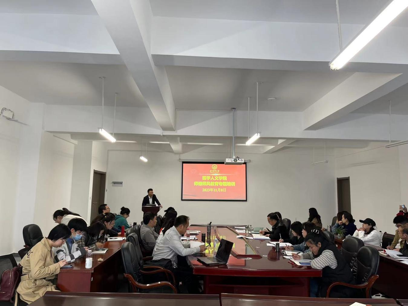 11月8日,人生就是博ag(中国区)·公司官网组织开展师德师风教育专题培训。公司党委班子成员、全体教职工参加。学院正处级组织员韩贞习主讲。