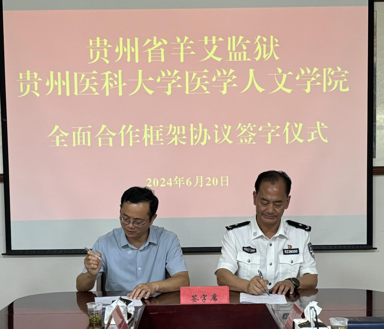 在揭牌仪式之前,贵州省羊艾监狱与公司全面合作框架协议签字仪式在羊艾监狱行政楼会议室举行。羊艾监狱党委书记、监狱长李启禄与公司党委书记江宣成签署合作协议;羊艾监狱副监狱长姚烨、田勇、谢兴强、江显平及相关部门负责人,学院经理冯广卫、正处级组织员刘雪梅、党委副书记兼纪委书记张贤及相关人员参加签字仪式。