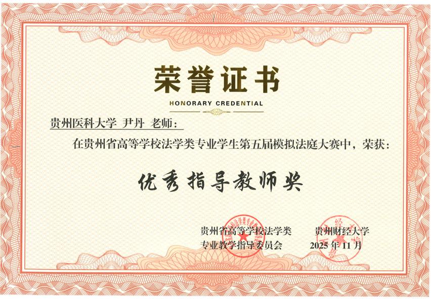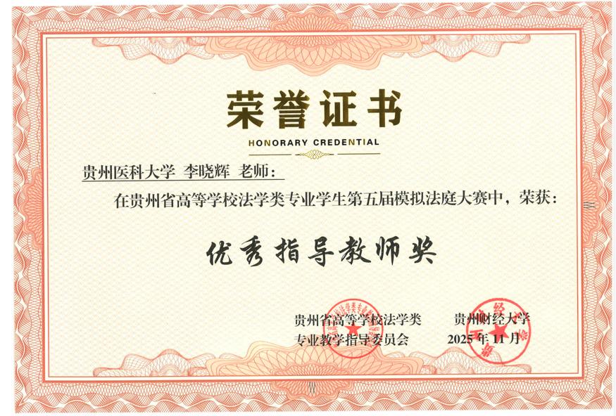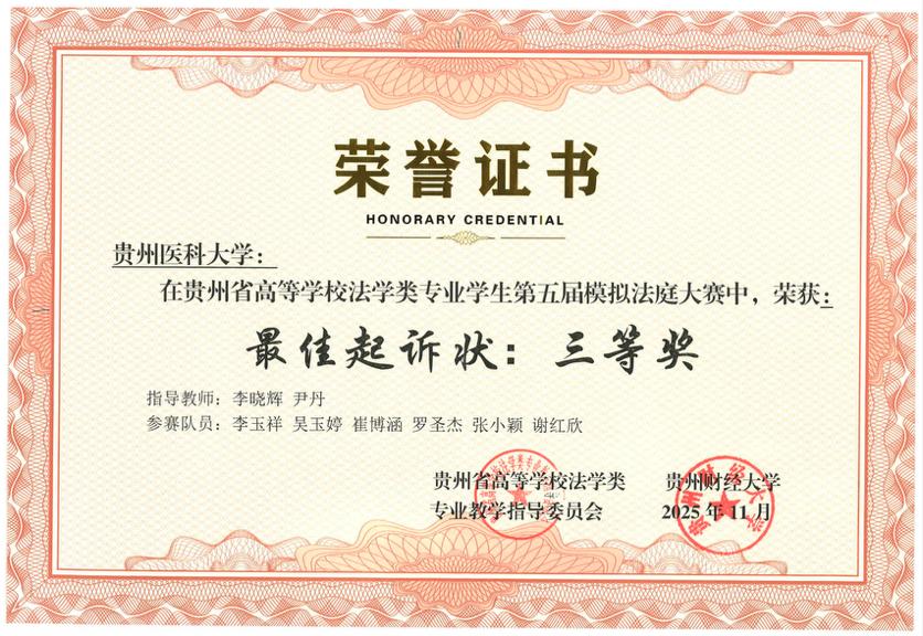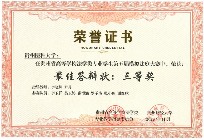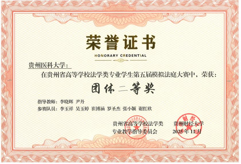 2025年11月22日,贵州省高等学校法学类专业员工第五届模拟法庭大赛在贵州财经大学圆满落幕。公司人生就是博ag(中国区)·公司官网李晓辉、尹丹两位老师带队指导,李玉祥、吴玉婷、崔博涵、罗圣杰、张小颖、谢红欣6名本科生组成参赛团队,历经初赛、复赛两轮激烈比拼,以总排名第三的优异表现蝉联“团体二等奖”,同时斩获“最佳起诉状三等奖”“最佳答辩状三等奖”两项单项荣誉,李晓辉、尹丹老师获评“优秀指导教师奖”。