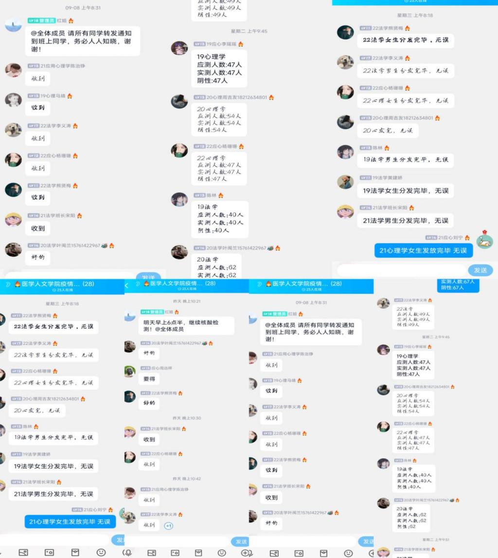 接到疫情防控通知后,员工干部及时下达消息,确保每一位同学都知悉学院通知。防控期间,员工干部严格执行相关规定,每天督促同学们完成今日校园的日常健康监测填报,一丝不苟,不落一人。做新冠抗原检测时,他们会提前一个半小时领取抗原检测物品,在确认数量无误、包装完好后登记领取人信息。随后,亲自发放抗原检测物品至每一位同学手中,督促同学们及时完成检测并填报表格。接收到当天需要做核酸检测的通知时,及时下达消息,收集上报检测结果等工作。