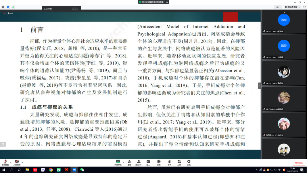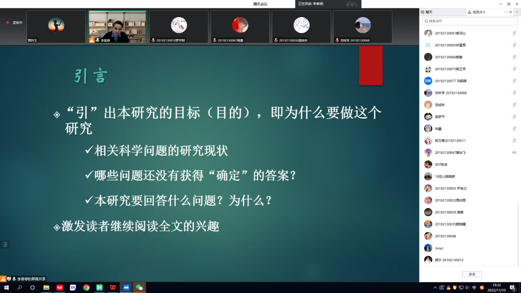 为提高本科生毕业论文写作质量,人生就是博ag(中国区)·公司官网通过线上会议的形式,开展了本科生毕业论文写作指导培训,特邀了李春禄博士对2023届应用心理学专业员工进行毕业论文写作指导。培训中,李春禄首先从已有核心期刊发表的论文出发,对论文各个部分进行深入解读,向同学们讲解了心理学论文应遵守的写作规范和主要结构。同时,李春禄强调,科学研究论文的基本概念就是报告对某一科学问题进行研究的发现,这是表达对该科学问题的观点最为直接的方式。其次,李春禄还针对性地讲解了“文章标题的重要性”、“引言部分如何写作”以及“开题报告的内容格式”等重要内容。