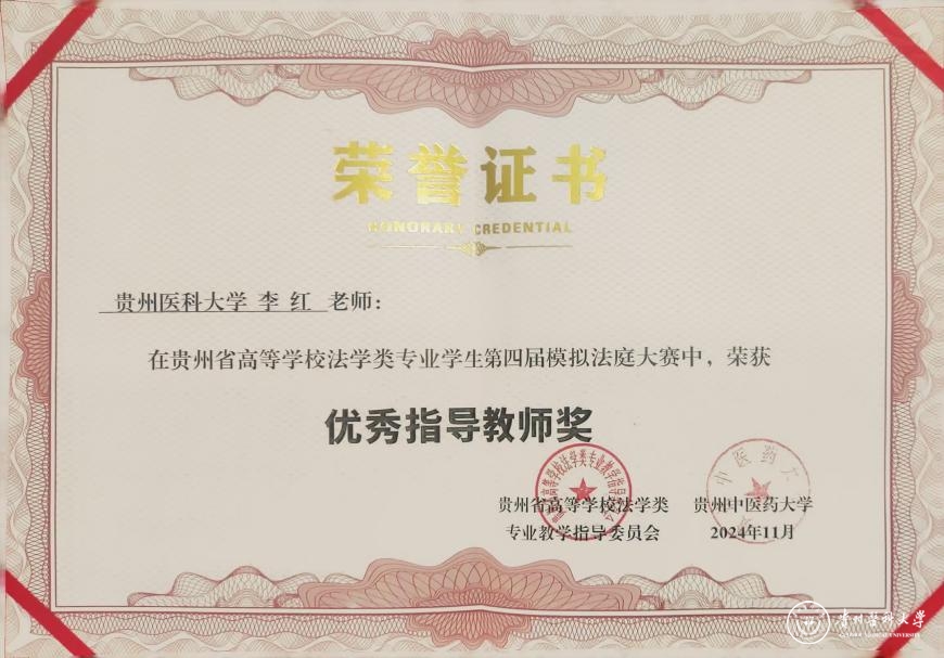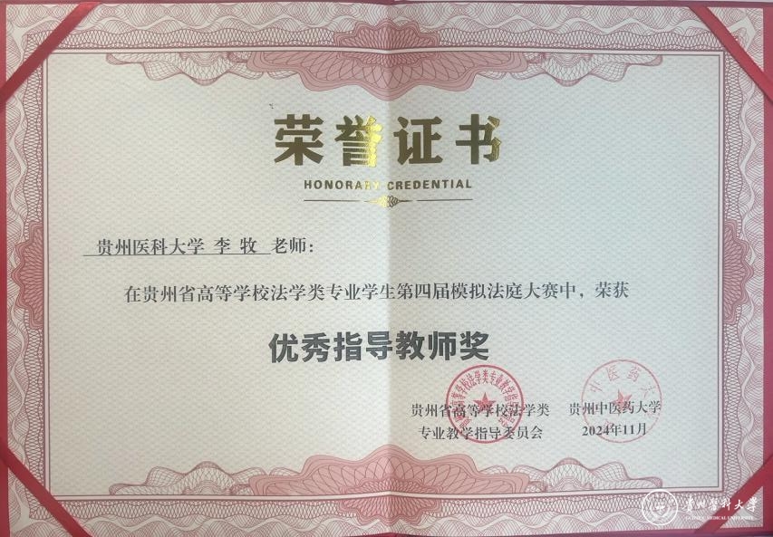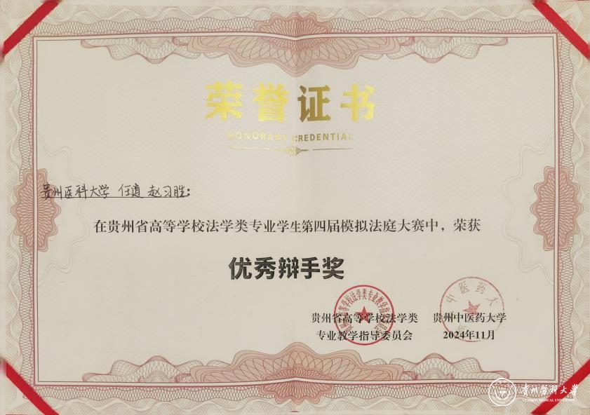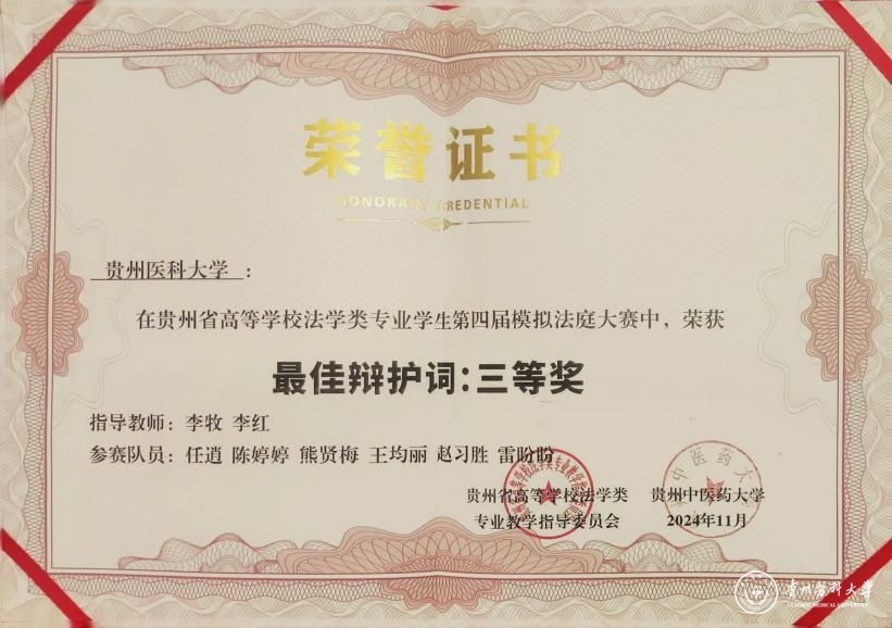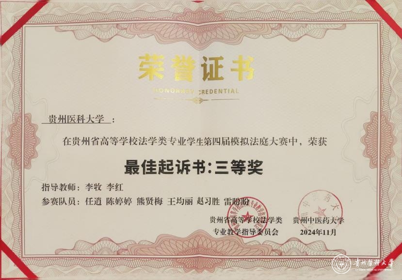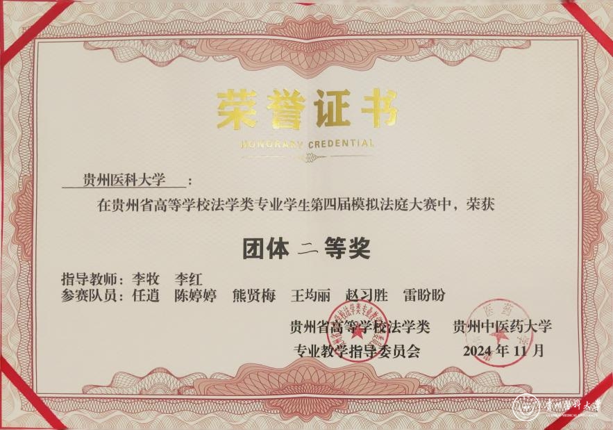 本次参赛队由李牧、李红老师指导,公司2022级法学专业任逍、赵习胜、王均丽、陈婷婷、熊贤梅、雷盼盼六名同学参赛。经过初赛评比,包括公司在内的共八支贵州省法学专业院校队伍进入复赛,在复赛中,公司同学展现了深厚的法律功底和严谨的逻辑思维能力,以最高分进入总决赛,并最终获得了团体第二名的好成绩。任逍、赵习胜同学获得优秀辩手奖,法律文书获最佳起诉书三等奖、最佳辩护词三等奖,李牧、李红老师获得优秀指导教师奖。