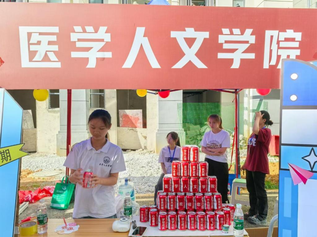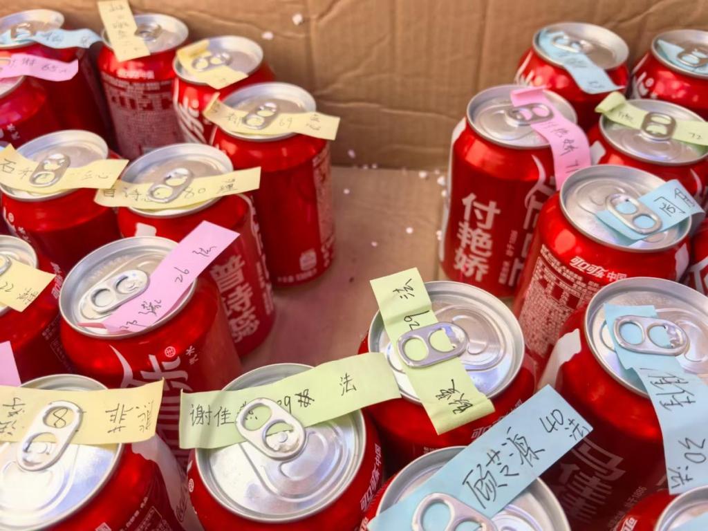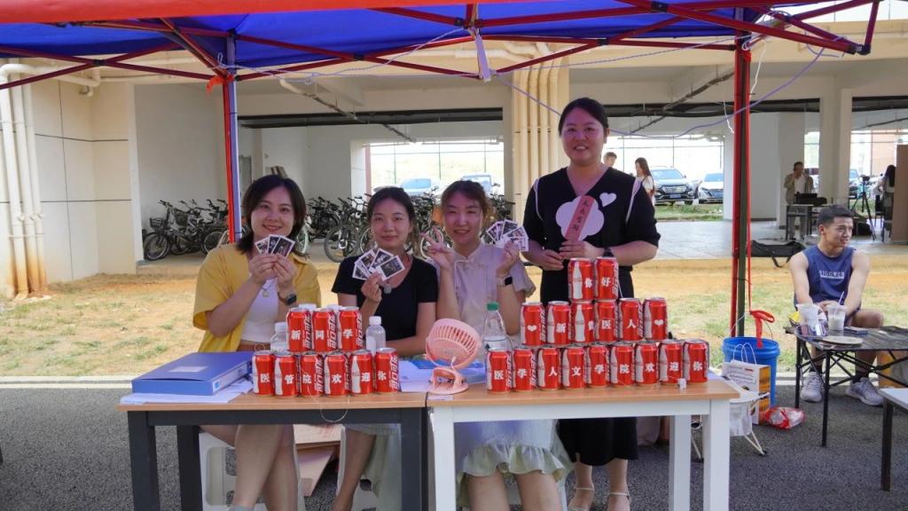 公司新生报到点考虑到天气炎热,学院为每一位新同学定制了个人姓名的可乐和带有祝福语的扇子希望在炎炎烈日中为新生送去一丝凉爽。