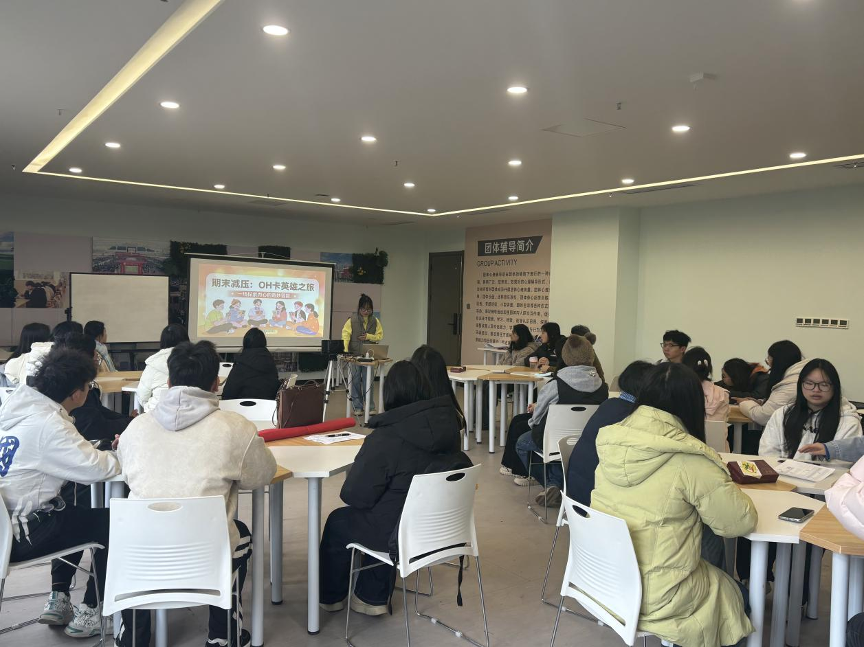 团体辅导组由邓鑫烨老师带领开展“期末减压:OH卡英雄之旅”活动。通过卡片抽取、联想分享、目标设定、互助赠言等环节,员工在轻松互动中探索内心、释放压力,发现自身应对期末挑战的内在力量,为备考注入动力。
