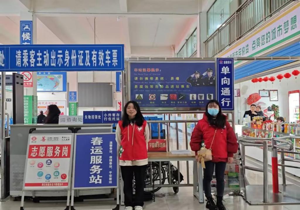 图五:冉拉芳与同伴在春运服务站做志愿者