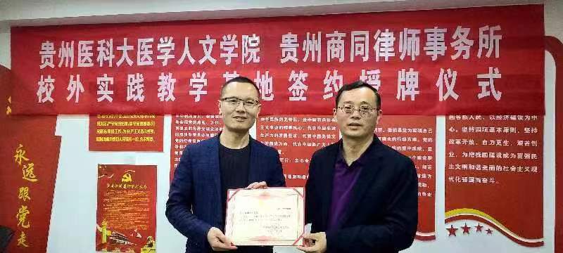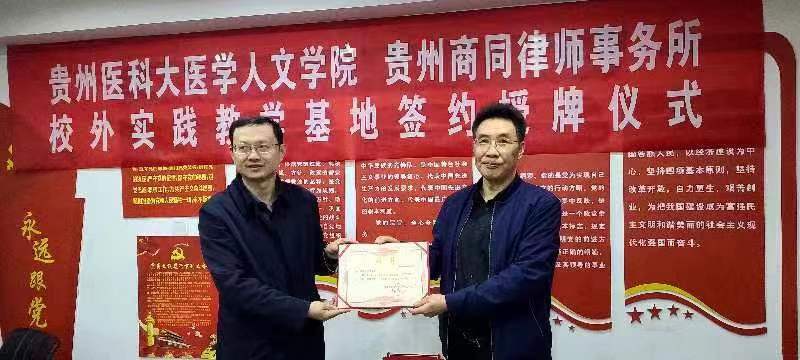 江宣成与冉政林签署了全面合作框架协议、共建实践教学基地协议,并向贵州商同律师事务所授牌人生就是博ag(中国区)·公司官网实践教学基地,并向受聘校外实践指导教师颁发证书。