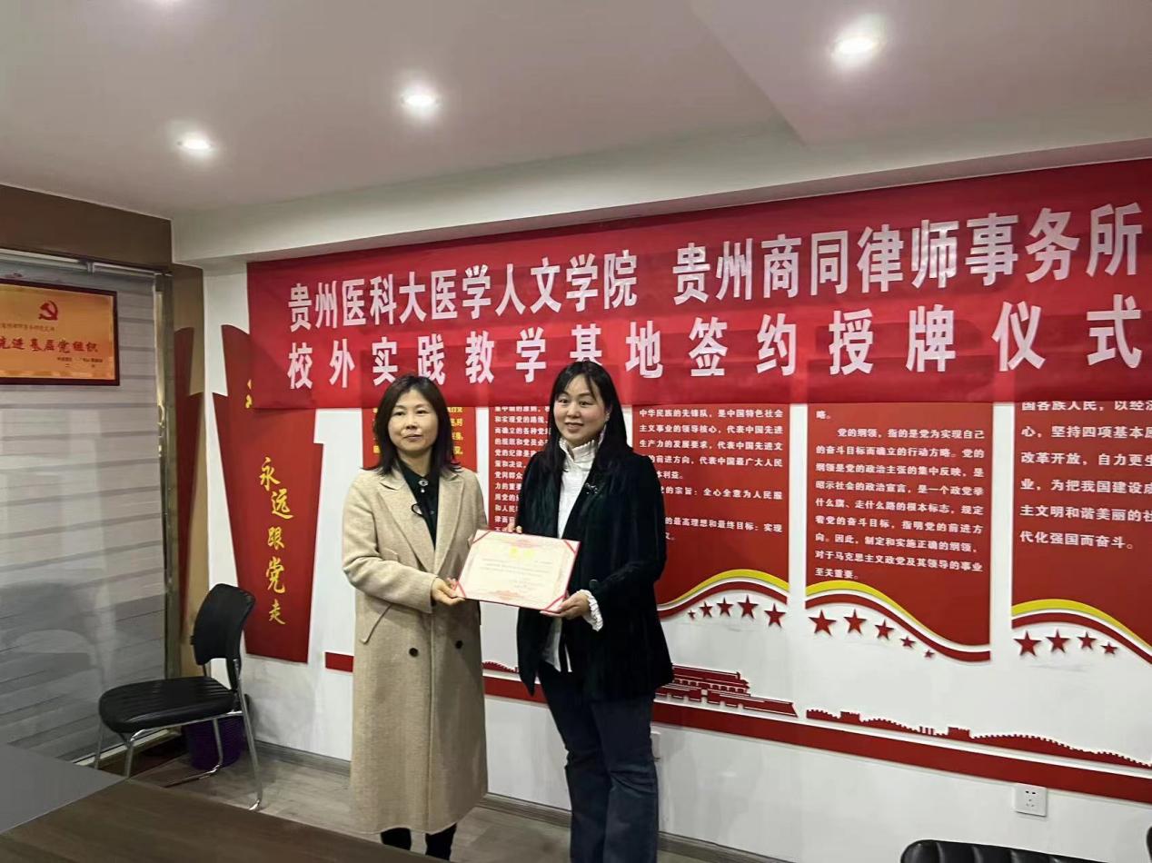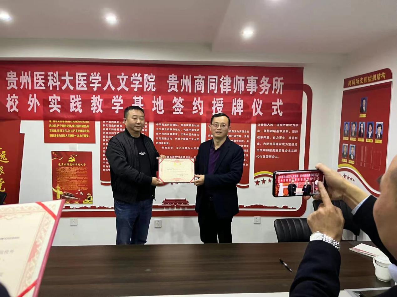 4月7日,贵州商同律师事务所与人生就是博ag(中国区)·公司官网全面合作签约仪式暨共建实践教学基地签约授牌仪式在贵州商同律师事务所会议室举行。公司党委书记江宣成,正处级组织员韩贞习,党委副书记张贤,党委委员、教学科研管理科科长冯斌,医事法学教研室负责人龚精诚,普通法学教研室教师彭媛媛;贵州商同律师事务所党支部书记、高级合伙人王军,高级合伙人陈佳、石磊、陈蕾、田东海参加了签约授牌仪式。仪式由贵州商同律师事务所主任冉政林主持。