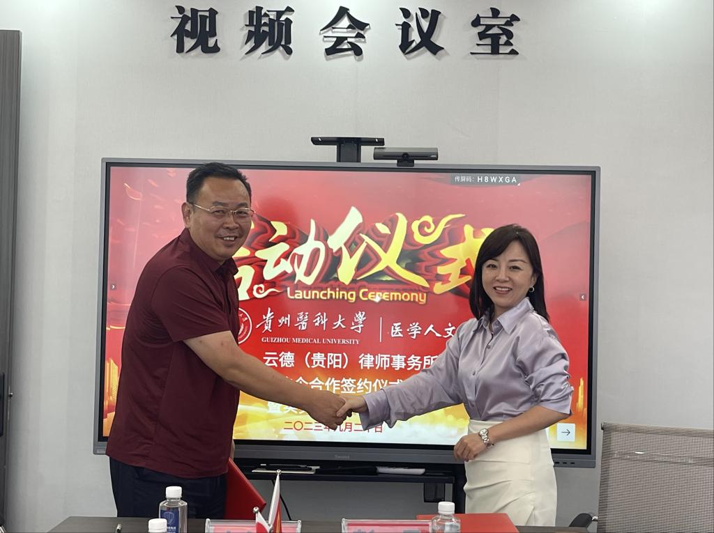 会上,江宣成代表学院向云德(贵阳)律师事务所授牌。韩贞习代表学院颁发校外实践指导教师聘书。张贤代表学院介绍学院成长历程、团队建设情况等。彭丹代表学院签订全面合作协议及共建实践教学基地协议。