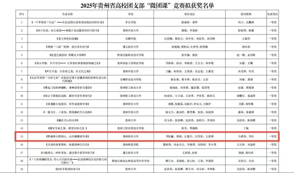 近日,2025年贵州省高校团支部“微团课”竞赛拟获奖名单正式公示。本次赛事历经高校择优推荐、专家网络评审、现场终审决赛等环节评选,全省193个优秀项目脱颖而出,公司选送的微团课作品《黔地烽火照初心,山河新颜谱华章》凭借深刻的思想内涵、新颖的呈现形式与真挚的情感表达,最终斩获省级一等奖。在决赛现场,公司参…